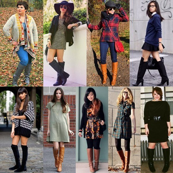 Высокие сапоги с широким голенищем более женственны и сексуальны, их можно сочетать с большим количеством платьев, туник и других любимых платьев. Замшевые модели на высоком каблуке и танкетке, которые визуально удлиняют пропорции фигуры, особенно хороши в этом плане. Кожаные и лаковые модели можно одевать в офис и на деловые встречи. Платье или юбка карандаш совершенно смотрятся с новым необычным аксессуаром. Они хороши и для повседневного ношения (особенно они хорошо смотрятся с одеждой повседневного стиля).