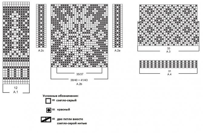Набираем спицами 72п. (для всех размеров одинаковое кол-во) красной пряжей. Вяжем вкруговую 1р. лицевыми п. Переходим на вязание резинки. Выполняем 4р. Далее – узор схемы А.1. В последнем ряду раппорта схемы доводим кол-во п. до 66; 72; 72 штук. После вывязывания одного вертикального раппорта распределяем петельки в ряду так: 5п. – сх. А.2а, 23; 29; 29п. – сх. А.2b, 5п. – сх. А.2с, 33п. – сх. А.3