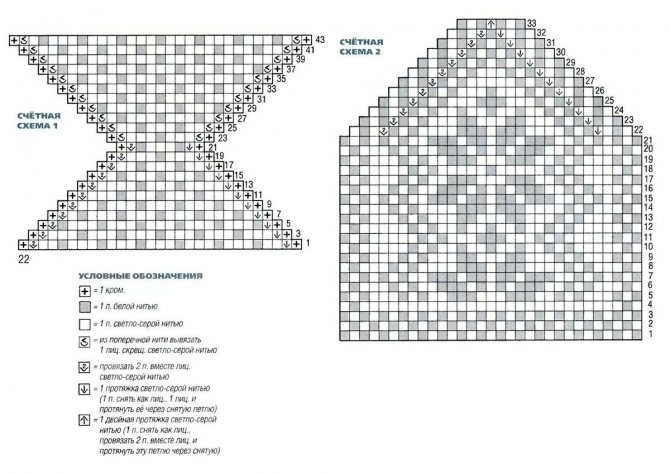 Мысок. Убавочный ряд: 1 лиц., 2 вместе лиц. с наклоном влево, лиц. до конца спицы 1; лиц. до последних 3 пет. спицы 2, 2 вместе лиц., 1 лиц.; 1 лиц., 2 вместе лиц. с наклоном влево, лиц. до конца ряда спицы 3; лиц. до последних 3 пет. спицы 4, 2 вместе лиц., 1 лиц. (4 пет. убавлено). След. ряд — все петли лицевые. Повторять эти 2 ряда еще 7 раз = 34 пет.