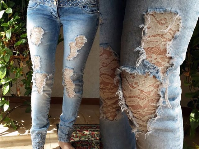 Понадобятся белые или черные кружевные лоскуты или ленты, нитки того же цвета. Мелкими стежками ткань пришивают изнутри, следуя контуру разреза. Ажурную нашивку можно пришить также с лицевой стороны поверх дыры. Необязательно делать отдельные джинсы с ажурными вставками. Можно просто надевать под них узорчатые колготки. Вместо гипюра оригинально смотрится кусок джинсовой ткани изнанкой наружу.