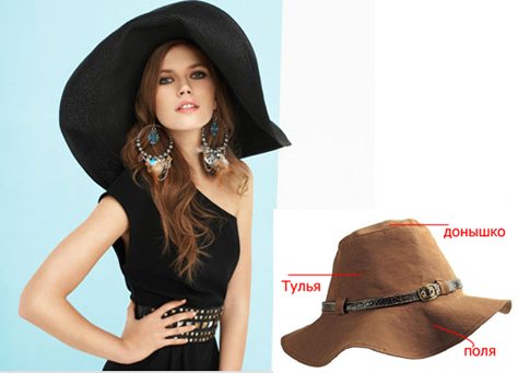 Из плотной шелковой ткани, однотонной или с набивным рисунком можно изготовить элегантную широкополую шляпу. Головка ее состоит из шести клиньев, поля представляют круг с отверстием посередине, цельнокроеный или состоящий из двух-четырех частей (в зависимости от раскладки деталей на ткани). Поля должны быть двойными с тонкой, но жесткой прокладкой. Для устойчивости формы их оформляют рядами строчек .Шов притачивания поля к головке можно закрыть шелковой лентой, драпированной полоской ткани, выкроенной по косой нити и украсить декоративными цветами.Источник: Ерзенкова Н.В. «Свой дом украшу я сама», Минск, 1994