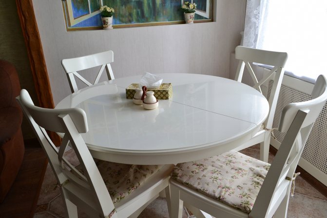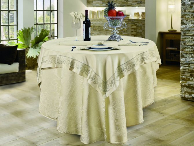 Столешница нестандартной формы – частая проблема при оформлении кухни. Круглый стол смотрится интересно, но подобрать на него текстиль бывает нелегкой задачей. Чаще всего для овальной столешницы покупают круглую либо квадратную скатерку. Иногда одну скатерть дополняют другой, более короткой, в качестве интересного элемента интерьера.