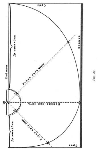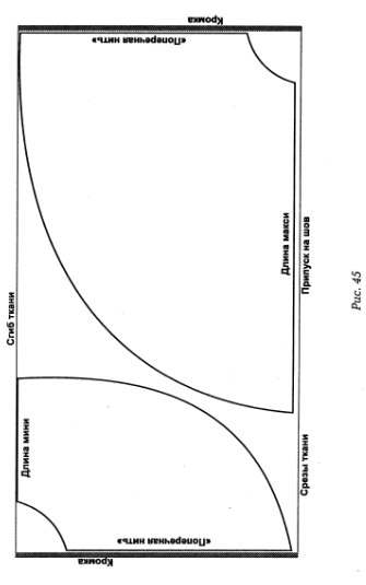Отметьте все величины на бумаге и соедините плавными линиями. Если полуобхват талии менее 45 см, то можно нарисовать выкройку сразу на ткани. В противном случае выкройка изначально наносится на бумагу, затем бумага разрезается и укладывается на ткань «валетом» (показано на чертеже).