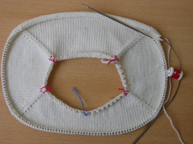 Линии реглана отмечают цветной нитью или булавками, чтобы не пропускать их. Спицами сверху вывязывают рукав.