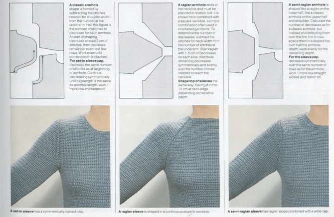 В каждом изделии используется свой вид рукава. Форма рукава зависит от способа вязания, это может вывязываться регланом сверху, регланом снизу и пришиваемым или находится в самом полотне.