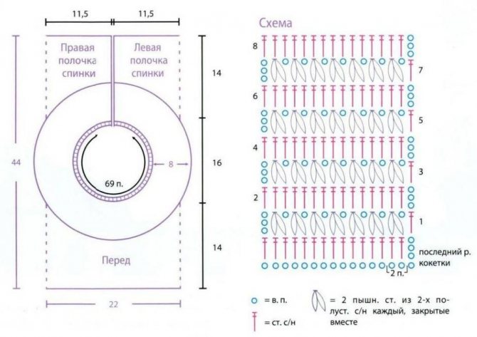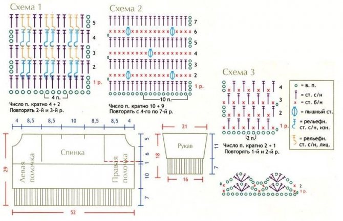 Для правой набираем крючком 28 в. п. в цепочку. Вяжем 1-4 рр. по сх. 1. Далее делаем приб. со стороны горловины по сх. 3, возле пройм оставляем полотно ровным.