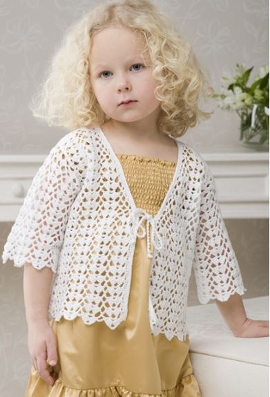 Одежду для девочки декорируют блестящими стразами, атласными бантами и кружевом. Принято считать, что вещи, связанные крючком, используют только как защиту от холода и мороза. Но ажурными жилетками можно также дополнить образ маленькой принцессы в прохладный летний вечер.