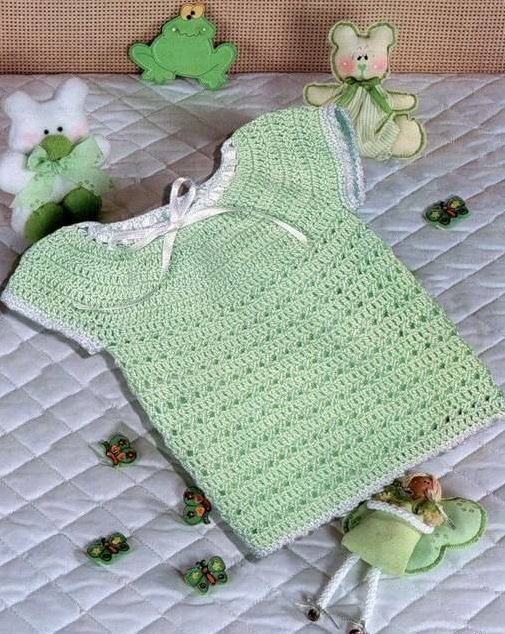 Обвязываем крючком вырез горловинки белой ниточкой, делая дырочки для ленты, затем края полочек спины 3 р. с. без н., выполняя на пр. п. сп. 5 п. для пуговок.