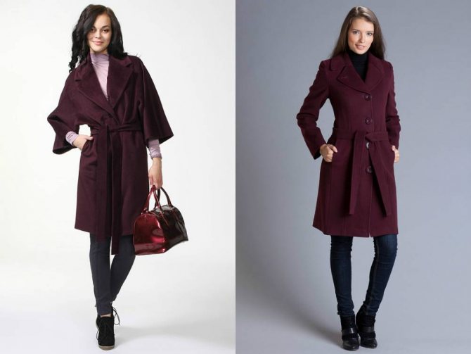 Оттенки выбранных нарядов не должны диссонировать с тоном верхней одежды. Ниже представлены примеры сочетания нарядов с пальто цвета марсала.