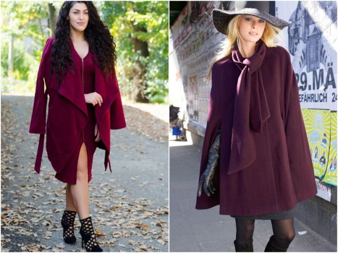 - кейп – этот фасон идеально подходит для создания винтажного образа, чему способствует и цвет марсала, отсылающий нас к ретро-стилю. Модель отличается свободным, расклешенным книзу силуэтом и отсутствием рукавов: для рук предусмотрены прорези. Такое пальто подходит высоким женщинам, носить его принято в межсезонье;