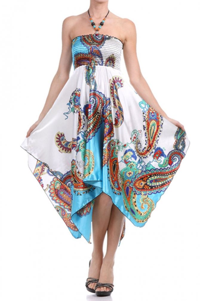 , смастеренное за пять минут, при всей своей простоте, тоже требует к себе внимания в подборе остального наряда и аксессуаров. Особенно же требовательны настоящие платковые платья. В плане обуви к ним можно остановиться на босоножках с высокой платформой, балетках или «гладиаторах». А вот, допустим, кеды, как и лодочки на шпильке, окажутся не в тему. Нужно правильно сочетать цвет обуви и платья, делать акцент на фактуре и орнаменте, который есть на платке. Можно комбинировать с платьем и пляжную сумку, и небольшую сумку-клатч, предназначенную для выхода в свет вечером.