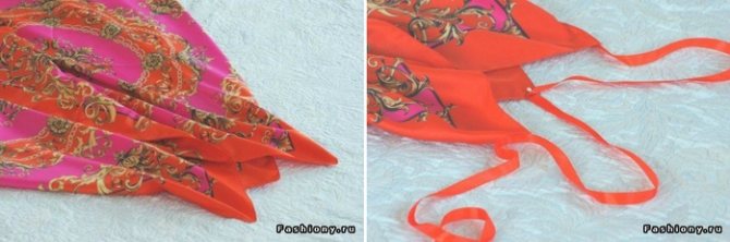 - От каждого платка отрезается с одной стороны полоска шириной приблизительно в 5-6 см. Они потребуются в дальнейшем для бретелей. Пока они откладываются.