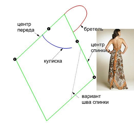 Пришиваем бретельки. Далее обворачиваем платок вокруг тела и отмечаем начало среднего шва спинки. Стачиваем срезы от отметки вниз. Перекрещиваем на спине бретельки и пришиваем к спинке.