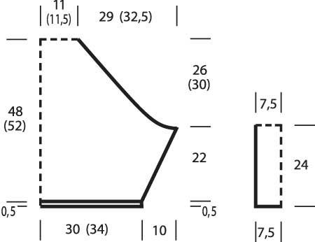Через 41,5 (45) см от планки оставить для плечевого скоса с обеих сторон по 3 п., затем в каждом 2-м ряду 14 раз по 3 п. и 4 раза по 4 п.), т.е вязать далее укороченными рядами. Одновременно через 55 (58,5) см от планки закрыть средние 27 (33) петли для горловины и обе стороны закончить раздельно. Для скругления по внутреннему краю закрыть в каждом 2-м ряду 1 раз по 3 п. и 1 раз по 2 п. Через 57,5 (61) см от нижней планки продолжить работу на всех оставленных по 57 (61) п. плеч резинкой для выполнения верхней планки. При этом поворотные накиды провязывать с предыдущей или последующей петлей вместе согласно узору во избежание образования дырочек. При ширине планки 2 см закрыть все петли по рисунку. Перед
