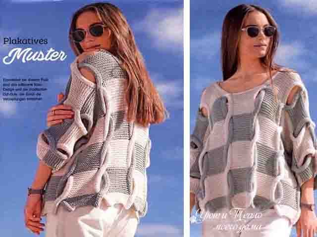 Довольно популярная до сих пор модель в стиле оверсайз с рукавом реглан и ажурным узором. Была опубликована в журнале «Сабрина».