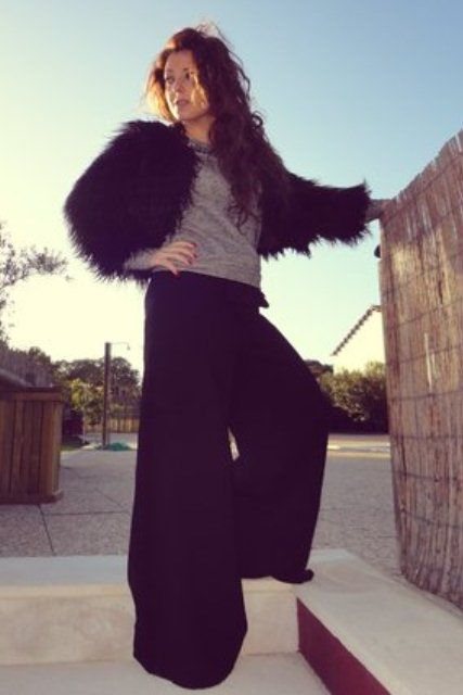 Также короткие шубки замечательно смотрятся с классическими брюками. Такие комплекты довольно популярны среди женщин с различными типами фигуры.