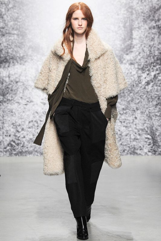 Оригинальная шуба больших размеров, бежевого тона, длиной до колен, с короткими рукавами из коллекции нового сезона от Paul & Joe в сочетании с блузкой болотного оттенка, широкими черными брюками и кожаными ботильонами черного цвета на каблуке Paul & Joe.