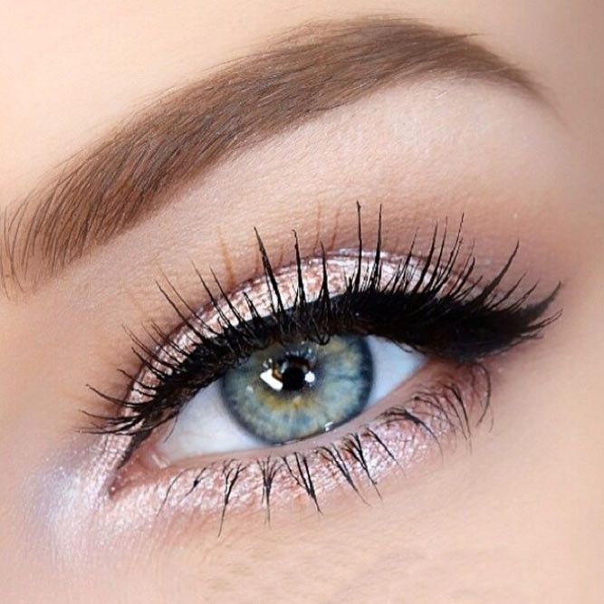 Начните нанесение макияжа с базового (светлого) оттенка теней, а затем постепенно добавляйте глубины. Беспроигрышным цветом для обладательниц голубых глаз является бронзовый. Его можно использовать как в обыденном макияже, так и в вечернем макияже для голубых глаз.