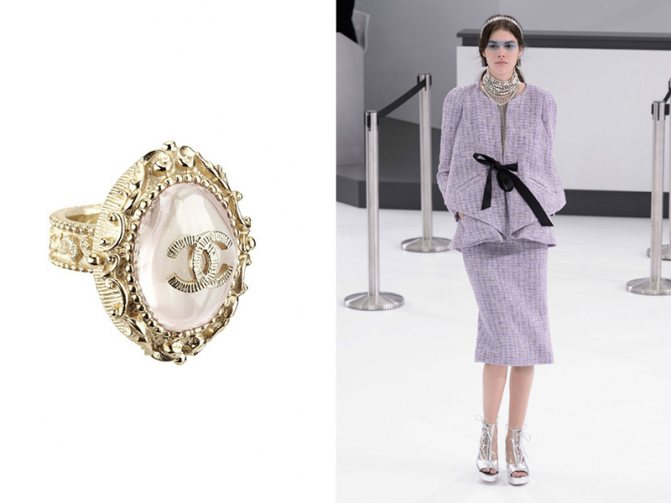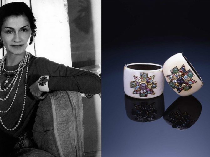 Хотя Шанель и принадлежит высказывание «Выбирая аксессуары, снимите то, что надели последним», сама она предпочитала надевать много украшений: носила ожерелья в несколько рядов, унизывала запястья браслетами, а пальцы – крупными кольцами. Коктейльное кольцо – детище и символ 1920–1930-х, когда в моде царила эпоха ар-деко и состоялся творческий взлет «великой мадемуазель», так что она не могла остаться равнодушной к «бунтарским» украшениям подпольных вечеринок с крепкими напитками. Шанель нравилось дополнять броские перстни широким гладким кольцом, надевая их вместе на один палец.
