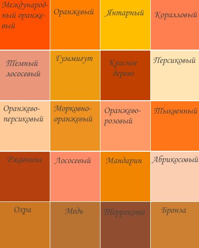 Оранжевый цвет – жизнерадостный, яркий, летний и позитивный цвет, динамичный и этнический, цвет блеска заходящего солнца. Ярко-оранжевый цвет хорошо сочетается с яркими цветами: ярко-желтый, горчичный, бежевый, фиолетовый, коричневый. Приглушенный оранжевый или терракот хорошо сочетается со спокойными оттенками — бледно-желтый, серо-зеленый, хаки, коричневый, каштановый, шоколад, темно-синий или темно-серый. К оранжевому и желтому цветам очень подходит контрастный черный цвет.