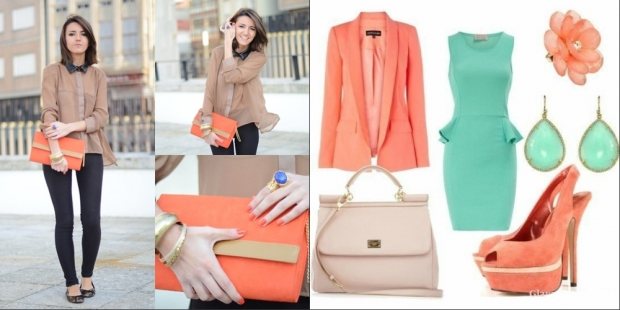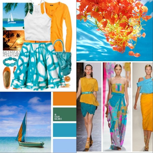 Сочетание оранжевого и бирюзового цвета в одежде | А вот сочетание с оранжевым тоном, казалось бы, схожего с голубым оттенка бирюзы, коренным образом меняет дело. Такой яркий тандем сможет достойно выдержать только красота зимних и летних девушек. Прекрасное летнее сочетание, которое напомнит о лете, море и апельсиновом соке. |