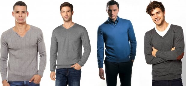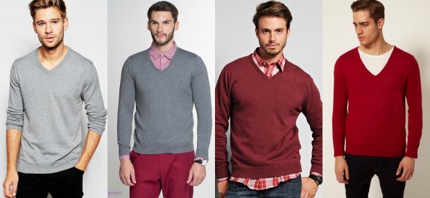 1) с классическим V-образным вырезом. Сочетаются с майкой, рубашкой, которую носят навыпуск или заправляют в брюки. Это зависит от обстановки: рубашка навыпуск предполагает неформальный стиль, заправленная в брюки – вариант для работы или учёбы. Иногда пуловеры носят на голое тело или на майку-алкоголичку.