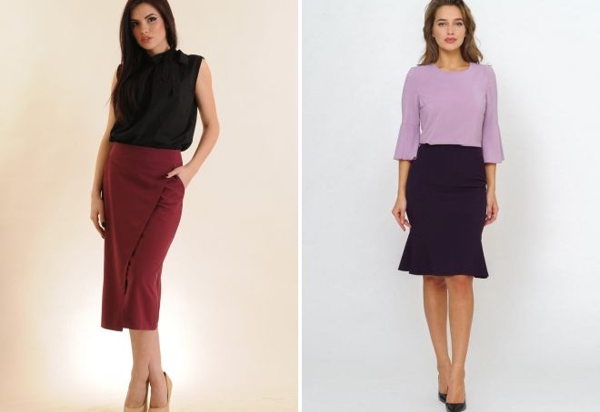 Баклажанового цвета юбка имеет большой спектр возможных сочетаний: