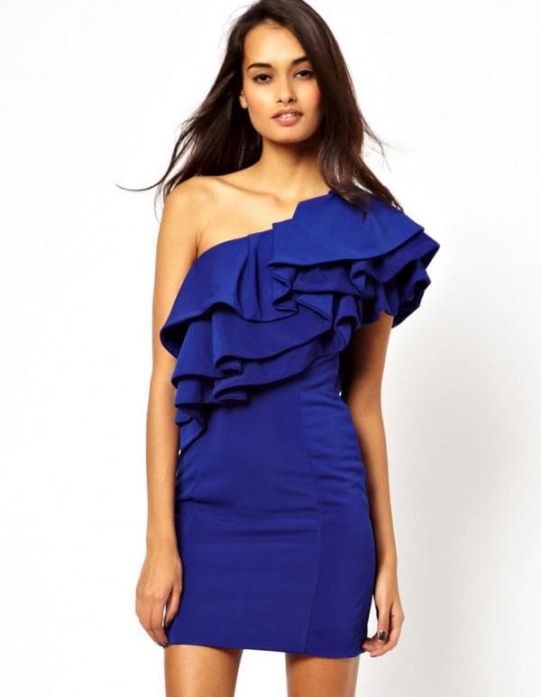 Если у вас стройная фигурка, вы можете приобрести элегантное облегающее мини черного цвета с лямкой на одно плечо (от 20-25$), украшенное на груди и плече рюшами в несколько слоев. Облегающая ткань подчеркнет изящность силуэта, а украшение в верху — красоту и хрупкость рук.