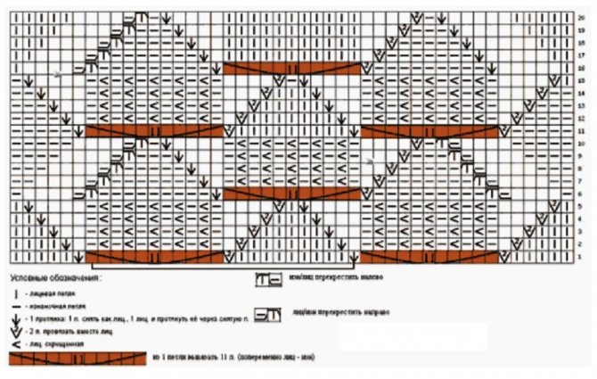 Изготовление такого узора будет лицевой гладью единожды или менять через определенное количество петелек. А если желаемый рисунок — зигзагообразная ажурная полоса, то в таком случае схему необходимо поделить пополам.