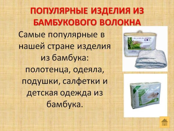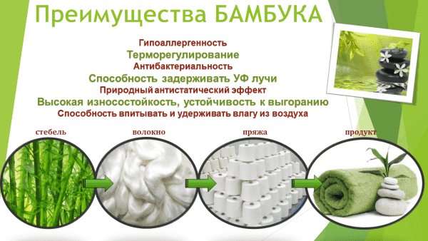 - 8Экологичность. Независимо от того, каким способом (механическим или химическим) произведено бамбуковое волокно, оно не выделяет никаких вредных веществ и считается абсолютно безопасным для здоровья.