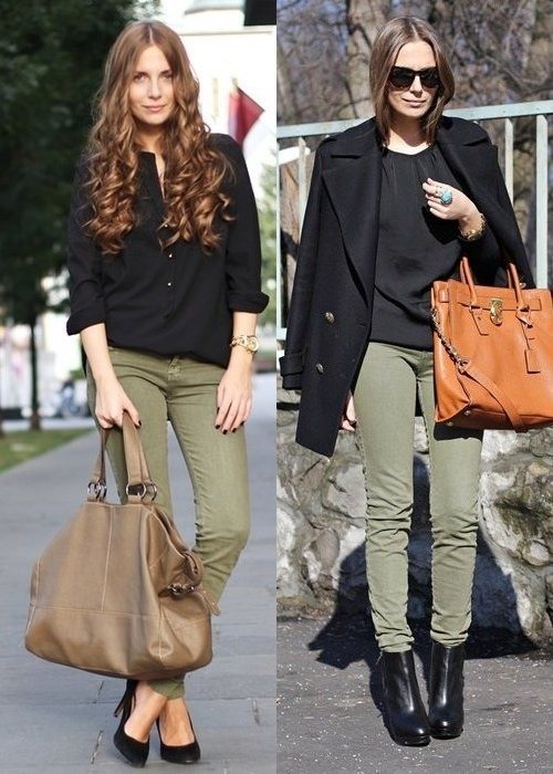 Существует стиль милитари лайт – это стиль, в котором отсутствует явное проявление военной тематики, но четко обрисованы главные элементы этого стиля! Сочетание минимализма и правильной цветовой гаммы даст Вам нужное направление! Вот, к примеру, два образа от модной блоггерши. Идеальное сочетание в стиле милитари – брюки болотного цвета, черная блузка и черное пальто!