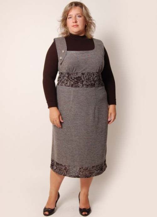 Для полных женщин предпочтительнее сарафаны А-силуэта или трапеция, которые позволяют удачно скрыть недостатки фигуры. Дополнительные крупные украшения отвлекут внимание от фигуры. Из материалов предпочтительнее твид или плотный трикотаж.