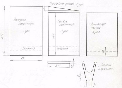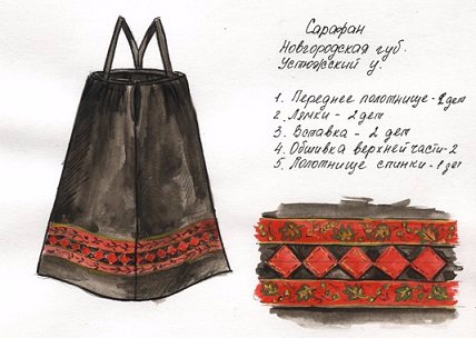 Сарафан сшит в виде высокой юбки (рис. 1.30) из семи прямых полотнищ темно-синей ткани. Два передних полотнища на 10 см длиннее задних, с которыми они соединяются треугольными боковыми вставками. В верхней части, на спине и груди, полотнища собраны под узкую обшивку и мелкие защипы (на спине — встречные), зафиксированные по лицевой стороне красной шерстяной нитью. Посередине груди имеется небольшой разрез, застегивающийся на пуговицу. Длинные узкие лямки крепятся на груди и середине спины. По низу сарафан украшен крупным орнаментом, выполненным в технике аппликации из красного узорного ситца: цепочку ромбов с обеих сторон обрамляют неширокие горизонтальные полосы. В верхней части сарафана края отмечены красной ситцевой бейкой.
