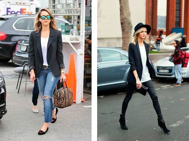 Либо – сочетание с узкой юбкой и белой блузой. На предложенных ниже фотографиях представлены сами свежие и стильные луки с черным пиджаком и жакетом.