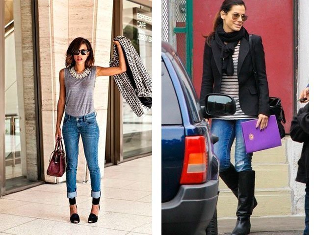 9. Шикарный образ как для офиса, так и для романтических прогулок: пиджак с принтом, серая майка, крупное колье, джинсы с подворотами и шпильки. 10. Сандра Баллок выбирает высокие кожаные сапоги и джинсы, майку в полоску и элегантный шарф. Согласитесь, она выглядит неподражаемо!