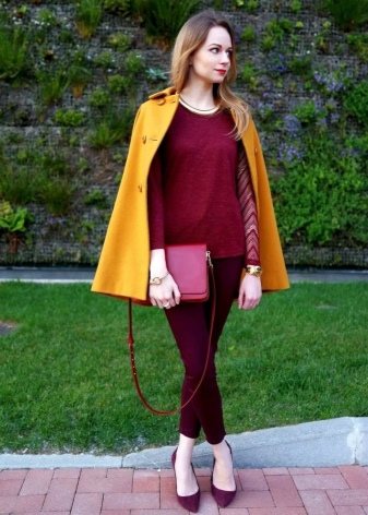- Горчичный теплый цвет плюс насыщенный бордовый или темно-красный. Это сочетание может позволить себе смелая, самодостаточная личность с творческим складом ума и яркой, запоминающейся внешностью.