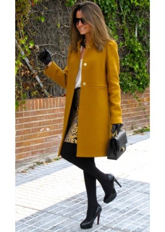 - У многих горчичная палитра ассоциируется с осенней порой, поэтому он идеально подходит для верхней одежды периода межсезонья. Для пальто прямого кроя стоит подобрать брюки коричневых оттенков или классические джинсы, в качестве обуви можно выбрать туфли или сапоги.