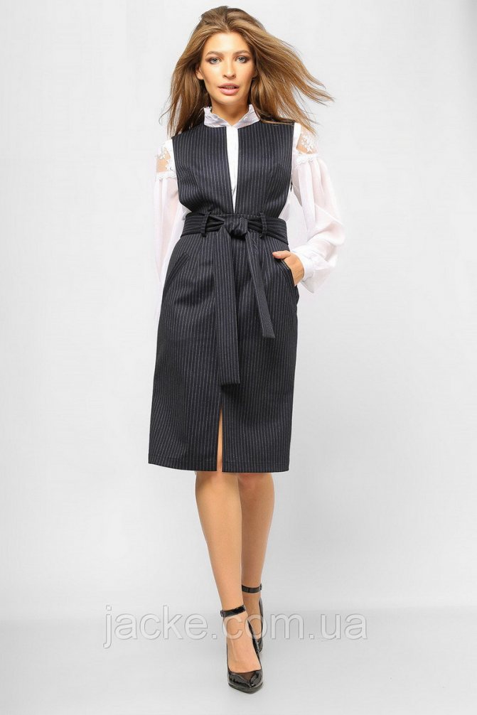 Поэтому модельеры сконструировали офисный сарафан на бретелях. Он представляет собой строгую юбку прямого покроя, к которой пришивается деталь, которая наподобие корсета облегает талию, а к ней уже крепятся бретели. Они имеют скорее декоративный характер и поскольку наряд способен держаться и без них.