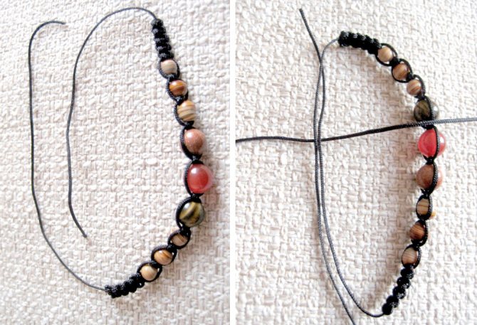 При использовании бусин в процессе плетения действия ничем не отличаются: бусины нанизаны на основу, а узелки завязываются между ними. Главное — не сдерживать фантазию: уверены, что у вас получится настоящий шедевр!