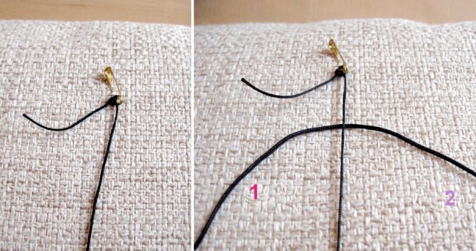 Обратите внимание на фото: чтобы сделать крепление, нужно сложить оба конца нити так, как показано на примере, вставить под них отрезок длиной 60 см.