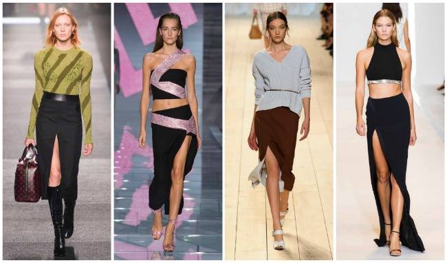 В вечернем наряде юбки с разрезом сочетаются с яркими и эффектными корсетами и бюстье. Актуальными элементами платьев для вечеринки являются асимметричный крой, разрезы, неровный подол, тонкие бретели на одно плечо, пристегивающиеся рукава.