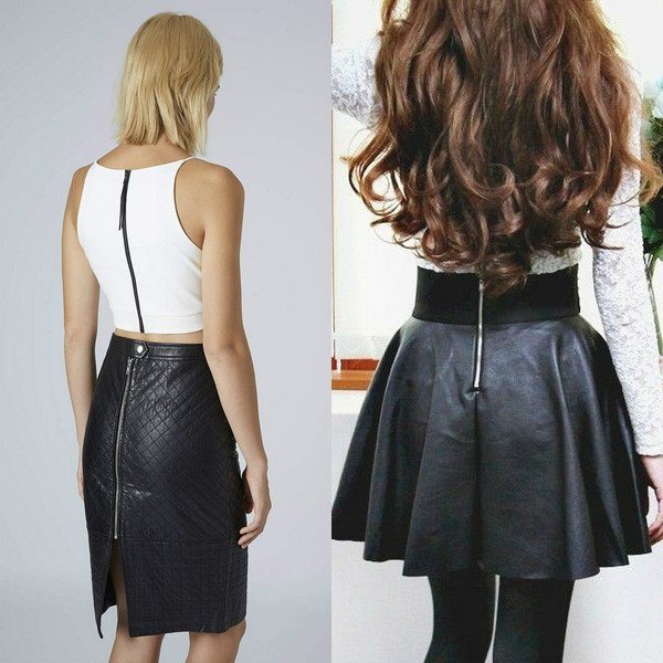 В этом сезоне стилисты отмечают необычайную актуальность кожаных юбок с молнией сзади, которые могут иметь совершенно любой фасон и длину. Но, сразу стоит отметить то, что самый модный из них – это облегающая бедра модель, которая придает образу заманчивость и стильную женственность. Если в таком изделии декоративная молния будет вшита по всей длине, то оно может визуально удлинить ноги и сделать их значительно стройнее, а наряд эффектнее.