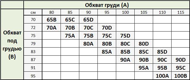 - На основе полученных данных найти соответствующий размер лифчика в размерной сетке производителя.