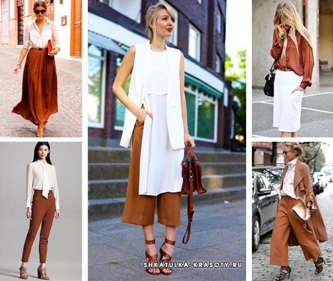 Красно-коричневая рубашка или блузка плюс белая юбка-карандаш или прямые брюки, либо рыжие брюки и белая легкая блузка — лаконичное и очень стильное решение для офисных будней.