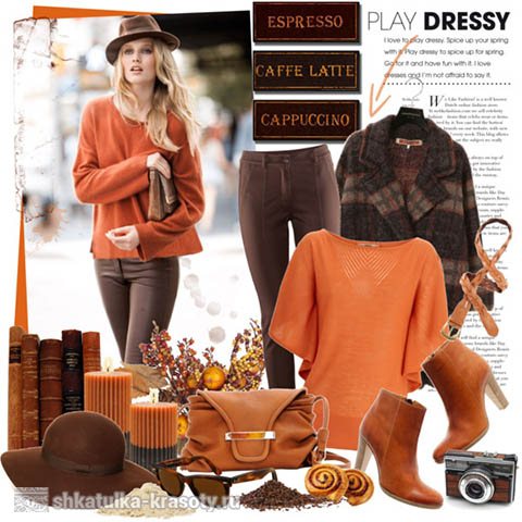 Кирпичный с желтым напоминает о теплой осени, ведь такая гамма характерна для этого времени года, но это совсем не означает, что их можно носить только осенью.