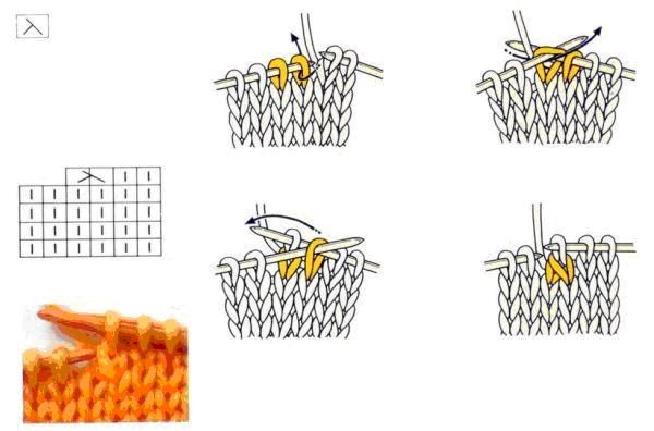 Множество схем содержит сдвоенные петли с наклонами. Для этого 2п. провязываются вместе как лицевая или как изнаночная. В зависимости от того, за какие стенки подцепляется петелька, наклон рисунка будет в одну или в другую сторону. Условные обозначения выглядят следующим образом. 2ЛП вместе: наклон вправо Рабочей спицей подцепляем сразу 2п. за передние стенки, цепляем нить. С левой иглы сбрасываем 2п.