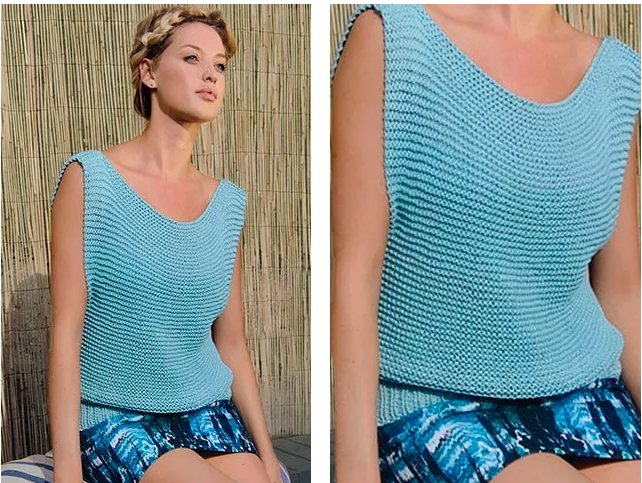 Вязаный топ Lagoon от Kim Hargreaves на лето связан спицами платочной вязкой.