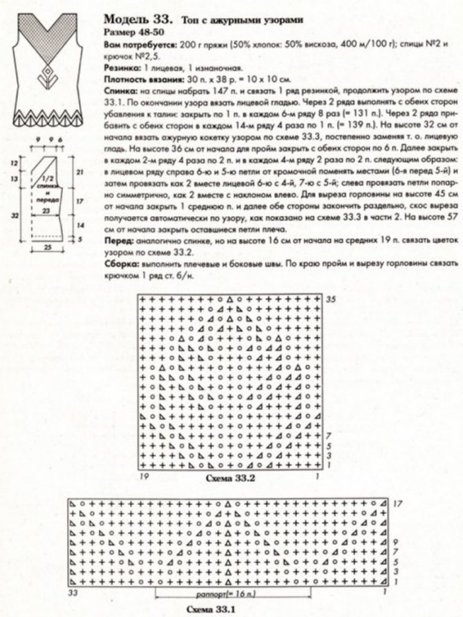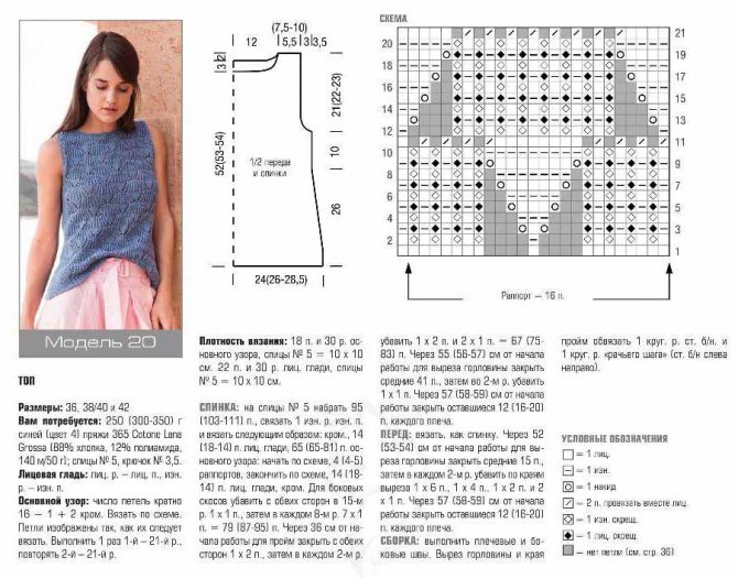 Модель имеет размер 38-40 и вяжется спицами №2,5 из 500 граммов пряжи, в состав которой входит 100% бамбук (450 м/100 г). Рукоделие выполняется такими узорами, как резинка 2х2, лицевая гладь, и ажур по схеме.