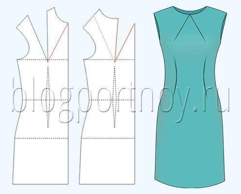 Изначально полочка выкройки-основы выглядит так, как на этой картинке. Нагрудная вытачка расположена от центра груди к плечевому шву. Моделировать будем только полочку. Рядом с полочкой вы видите платье. Именно такое платье получится, если нагрудную вытачку оставить как есть.