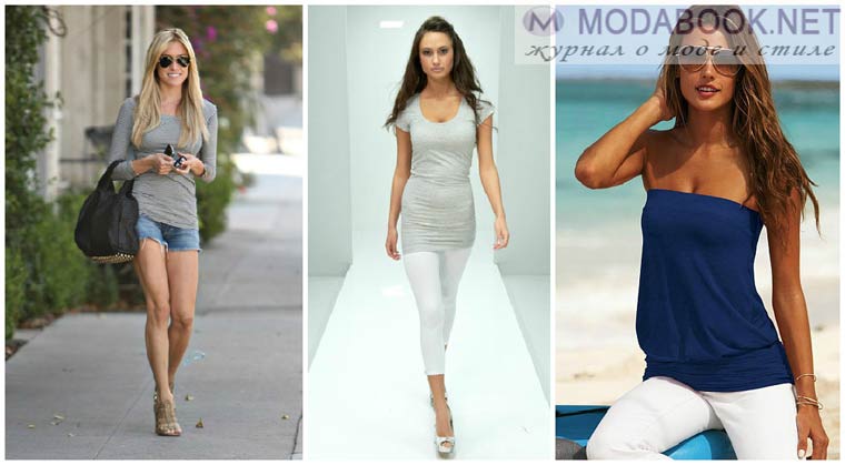 Длина до бедра хороша и для облегающих или свободных маек. Такие модели сочетаются практически с любым низом: от юбки мини до джинсов. Эффектная в тон наряду обувь завершит образ. Длинные женские майки в комплекте с максимально короткими шортами или юбочкой соперничают в этом сезоне с популярными мини-платьями. Удлиненная майка в паре с лосинами или леггинсами выгодно подчеркнет достоинства фигуры.